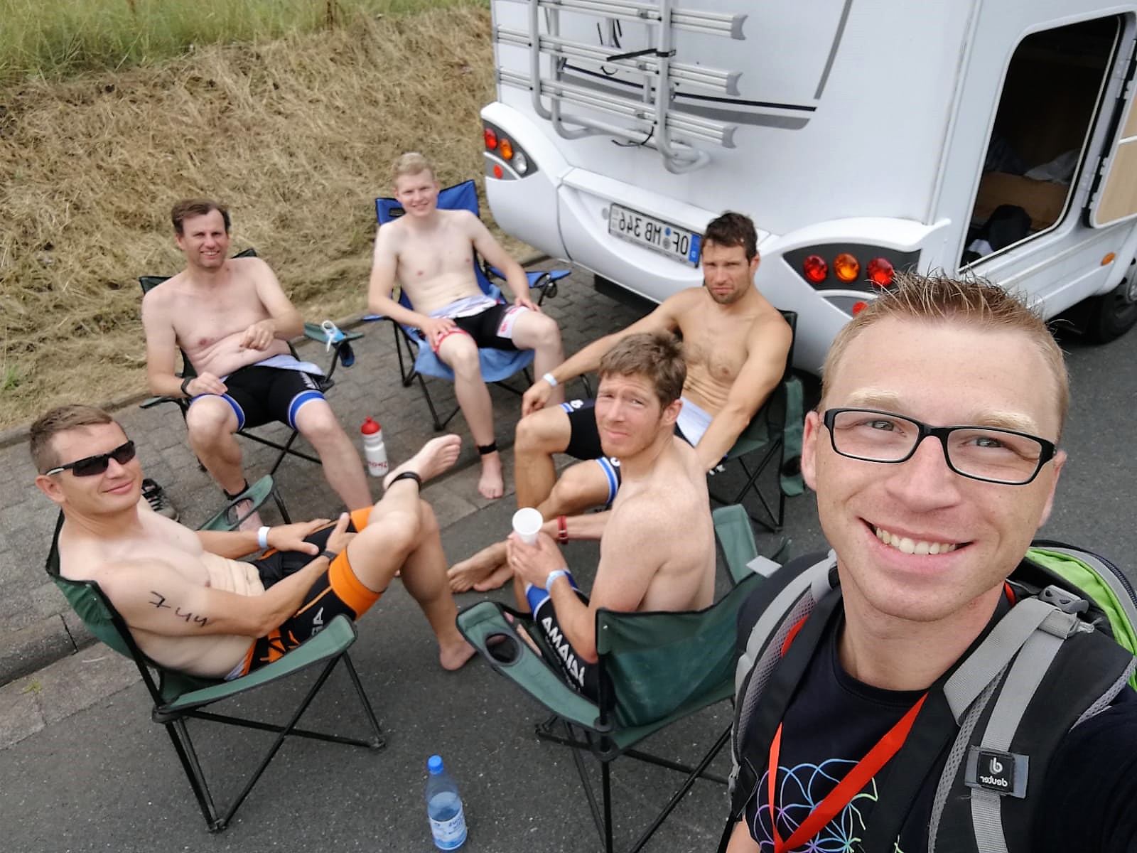 Die Zeit zwischendurch wurde effektiv zur Regeneration genutzt, in einem gemütlichen Kreis im Campingstuhl hinter dem Wohnmobil kam sogar ein wenig Lagerfeuer-Feeling auf, das Wetter war zudem noch freundlicher als erwartet. Der zweite Start erfolgte dann in den Abständen des Swim+Run. So sicherte sich Adrian direkt einen Platz ganz ober in der Gesamtwertung und ging auf Platz sieben und 40 Sekunden Rückstand auf den Führenden, in den abschließenden Triathlon. Während des Schwimmens kam ein kurzer Regen Schauer auf, der aber nicht lang anhielt, so das alle den restlichen Wettkampf bei trockenen Bedingungen beenden konnten.