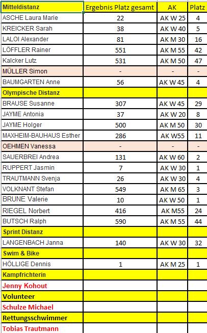 In der AK W30 hat Jasmin den 1. Platz erreicht. (Olympische Distanz) In der AK W50 hat Valerie den 1. Platz erreicht (Olympische Distanz) In der AK W60 hat Andrea den 2. Platz erkämpft. (Olympische Distanz) In der AK M65 hat es Stefan auf den 3. Platz geschafft. (Olympische Distanz) Knapp am Podest vorbei geschrammt auf Platz 4. sind Anne AK W 45 (Mitteldistanz) sowie Laura und Svenja in der AK W 25 und 30 (Olympische Distanz)Auch Glückwunsch an Susanne die ihre erste Olympische Distanz absolviert hat. Auch unsere beiden nicht ganz so Fitten Athleten haben großartige Leistungen erbracht. Esther die noch beim Möwahlton die Laufstrecke im Walking absolvierte ist diesmal gelaufen, Vanessa ist leider mit ihrem Fußproblem beim Laufen ausgestiegen.