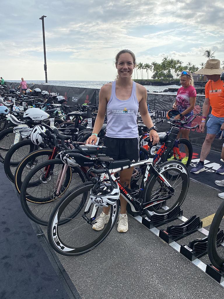 Am Renntag klingelte der Wecker um 3:30 Uhr. Nachdem die letzten Vorbereitungen getroffen wurden (Eincremen, Frühstücken und Startnummerntattoos anbringen) und ich von meiner Familie mit selbstbedruckten Supporter-T-Shirts überrascht wurde, nahmen wir den Shuttle von Hannes Hawaii Tours zur Wechselzone. Dort wurden wir von den zahlreichen Volunteers bereits gefeiert wie die Profis. Diese Unterstützung hat mir trotz extremer Anspannung, Aufregung und Konzentration ein Lächeln auf die Lippen gezaubert. Als ich mein Rad final vorbereitete und Luft auf die Reifen pumpen wollte, gab es einen kurzen Schockmoment. Mein Ventil am Hinterreifen war nämlich zu kurz für die Luftpumpe, wodurch ich plötzlich einen komplett platten Reifen hatte. Im dritten Anlauf habe ich aber zum Glück eine passende Luftpumpe gefunden. Einem erfolgreichen Rennen konnte nun nichts mehr im Wege stehen. Gegen 7 Uhr reihte ich mich in der Schlange zum Start mit den anderen Athletinnen meiner Altersklasse ein. Unter den Zuschauern entdeckte ich erfreut meine Vereinskollegin Silja mit ihrem Mann und ihrem Baby. Die drei machten gerade eine Weltreise und hatten diese so geplant, dass sie extra zum Ironman auf Hawaii sind, um mich anzufeuern. Während wir aufgeregt auf den Start warteten, sahen wir Lucy Charles-Barclay aus dem Wasser kommen und durch die Wechselzone zum Rad rennen. Das hat mir nochmal einen Motivationsschub gegeben. Kurz darauf durfte meine Altersklasse endlich ins Wasser. Wir waren die vorletzte Startgruppe und starteten eine Stunde nach den Profis. Zur Startlinie mussten wir noch ein gutes Stück schwimmen, so 100-200 m schätze ich. Dort mussten wir dann nochmal ca. 5 min bis zum Startschuss warten. Wir trieben im Wasser hin und her und jeder versuchte, sich eine gute Position zu ergattern. Als das Startsignal endlich fiel, versuchte ich, so wenig Arme und Beine wie möglich von den anderen Schwimmerinnen abzubekommen. Das Feld hat sich aber zum Glück relativ schnell auseinandergezogen und ich konnte die meiste Zeit ungestört schwimmen. Teilweise hatte ich sogar gar keine Athletinnen um mich herum. Leider war das Meer ziemlich wellig, weshalb es mir schwerfiel, in einen guten Rhythmus zu kommen. Irgendwann holten mich sogar Schwimmerinnen aus der Startgruppe nach mir ein. Aber ich machte weiter mein Ding und ließ mich von einer langsameren Schwimmzeit als sonst nicht beirren. Entschädigt wurde ich von mehreren Delfinen, die sogar zweimal unter mir durchschwammen. Das war unvergesslich! Nach 1:20 h war ich endlich wieder beim Pier angekommen, spülte kurz das Salzwasser ab und schwang mich dann aufs Rad. Mit lauten Anfeuerungsrufen von meiner Supportercrew ging es erstmal ein Stück durch Kona durch, dann die Palani Road hoch und endlich auf den Highway. Auf dem Hinweg nach Hawi hatten wir zunächst viel Rückenwind und ich hatte gut